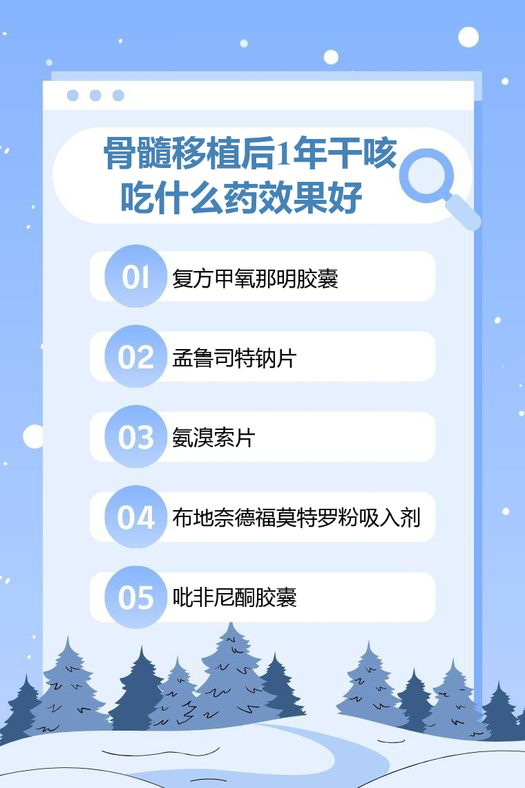 骨髓移植后1年干咳可以选择的药物有复方甲氧那明胶囊、孟鲁司特钠片、氨溴索片、布地奈德福莫特罗粉吸入剂、吡非尼酮胶囊等效果好。需要严格遵医嘱用药,不可自行随意增减剂量或停药。