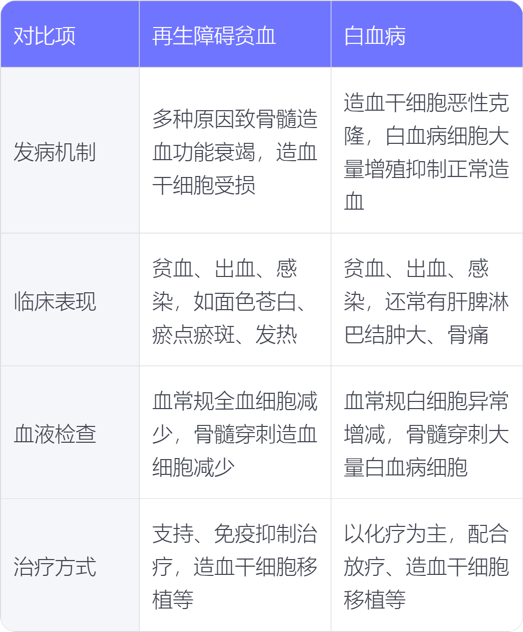 4. 治疗方式:再生障碍贫血治疗主要包括支持治疗、免疫抑制治疗、造血干细胞移植等;白血病治疗以化疗为主,根据病情配合放疗、造血干细胞移植等。