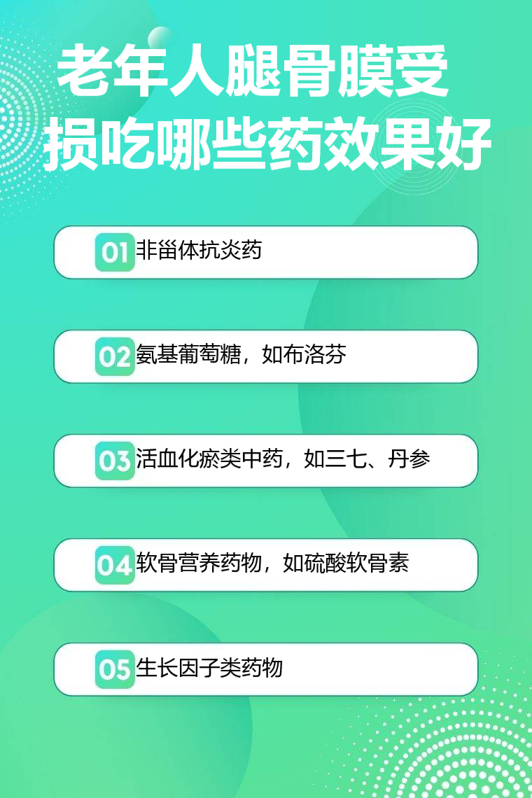 老年人腿骨膜受损一般吃非甾体抗炎药、氨基葡萄糖、活血化瘀类中药、软骨营养药物、生长因子类药物等效果好。用药都应在医生的指导下进行,不可自行随意用药。