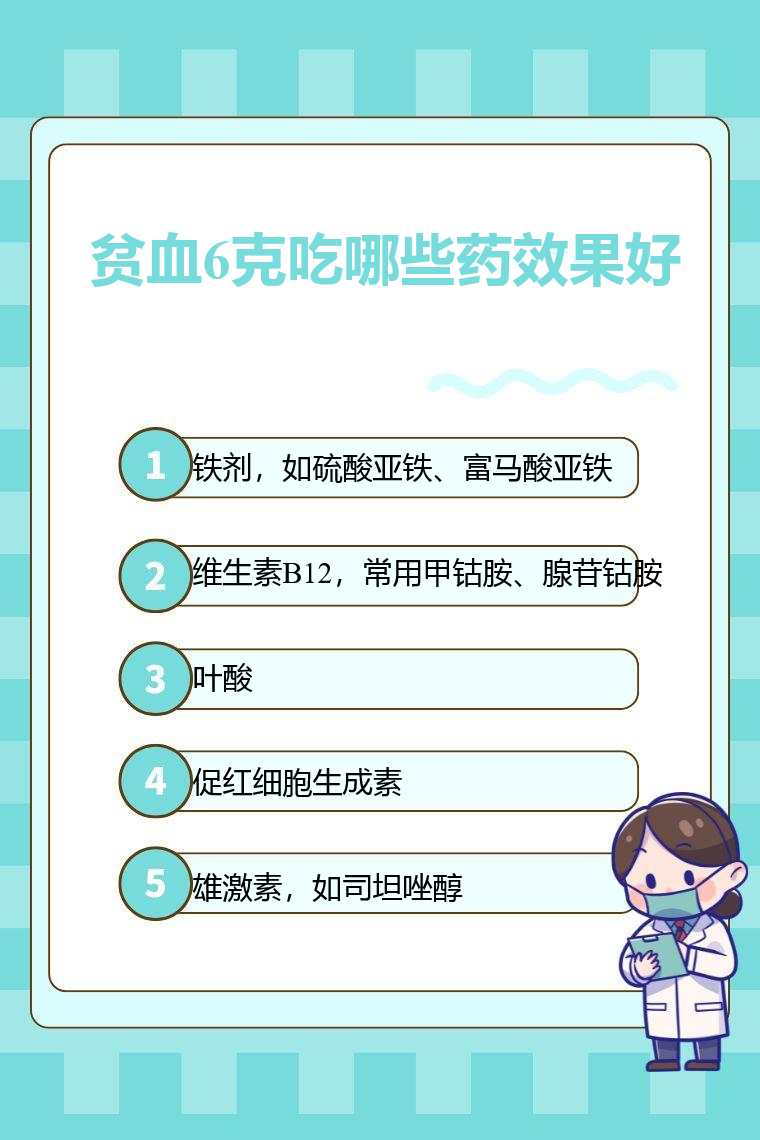 贫血6克可以选择的效果较好的药物有铁剂、维生素B12、叶酸、促红细胞生成素、雄激素,但都需要遵医嘱用药。
