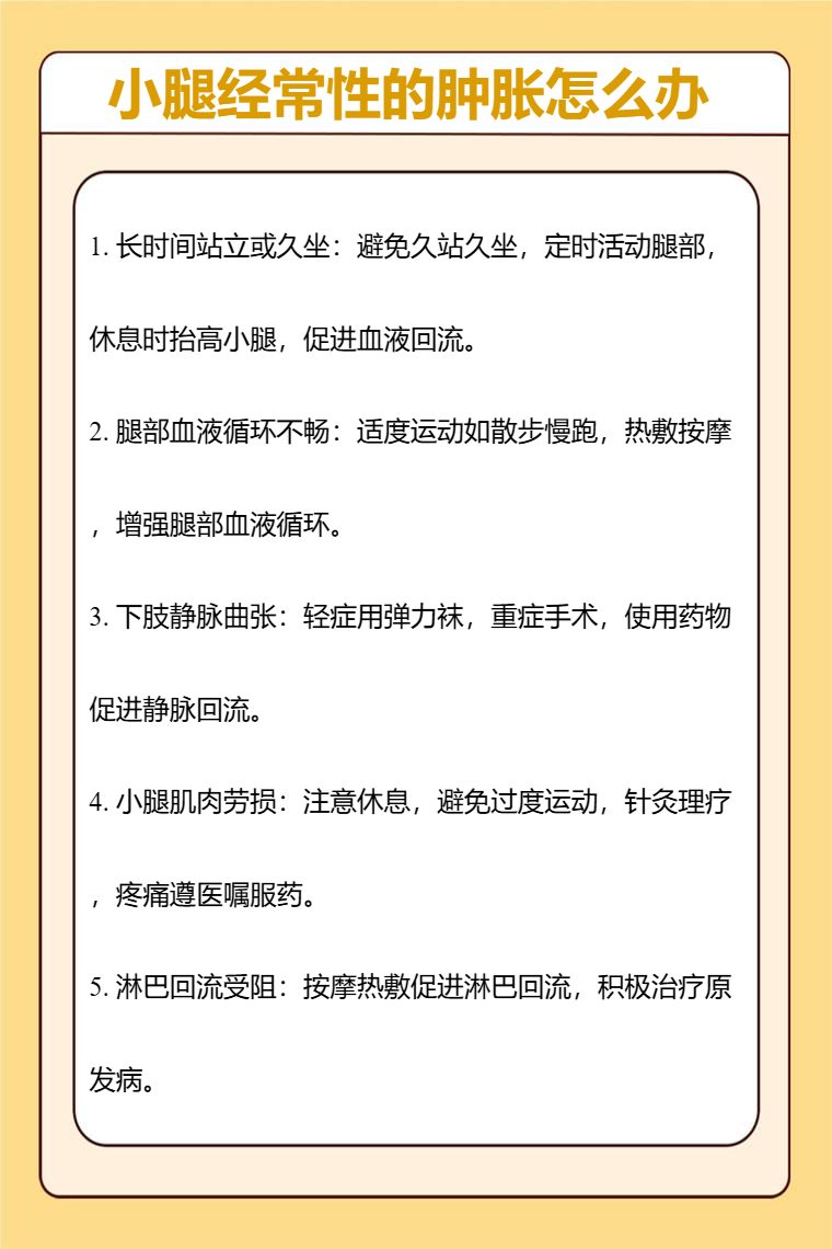 小腿经常性肿胀可能是长时间站立或久坐、腿部血液循环不畅、下肢静脉曲张、小腿肌肉劳损、淋巴回流受阻等因素,需要针对病因治疗,可采取的方法有改善生活习惯、物理治疗、药物治疗等。