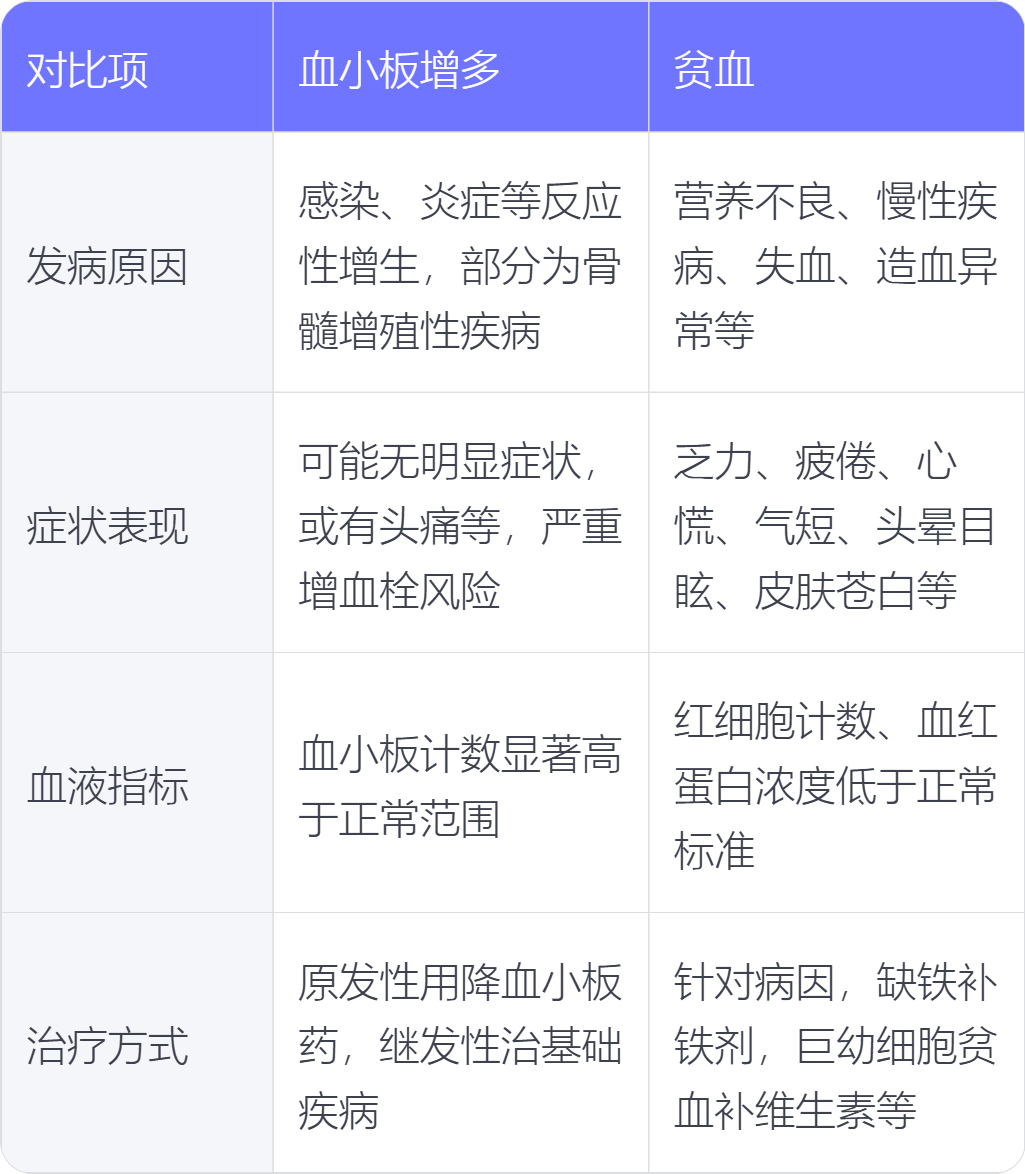 血小板增多与贫血在发病原因、症状表现、血液指标、治疗方式上存在不同。
