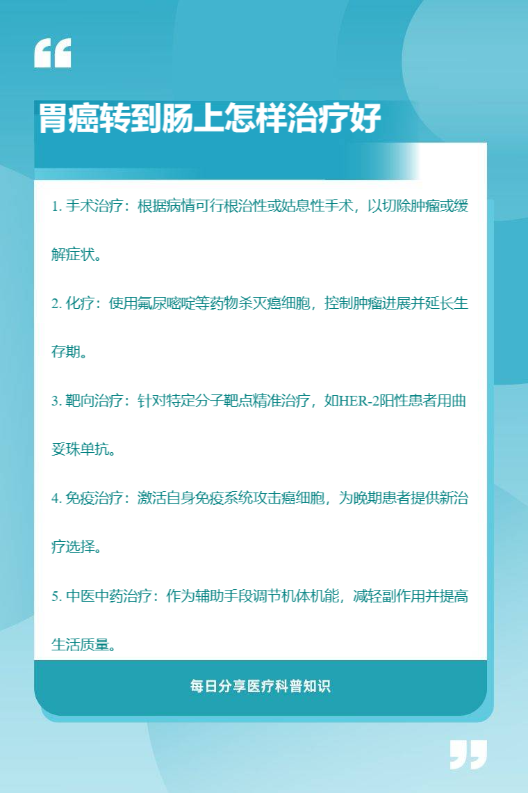 胃癌转移到肠上可通过手术治疗、化疗、靶向治疗、免疫治疗、中医中药治疗好。
