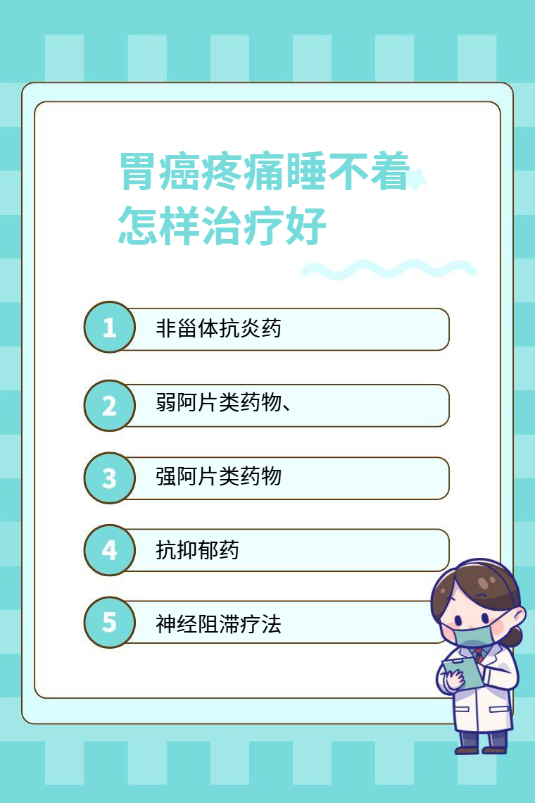 胃癌疼痛睡不着可通过使用非甾体抗炎药、弱阿片类药物、强阿片类药物、抗抑郁药、神经阻滞疗法等治疗好。
