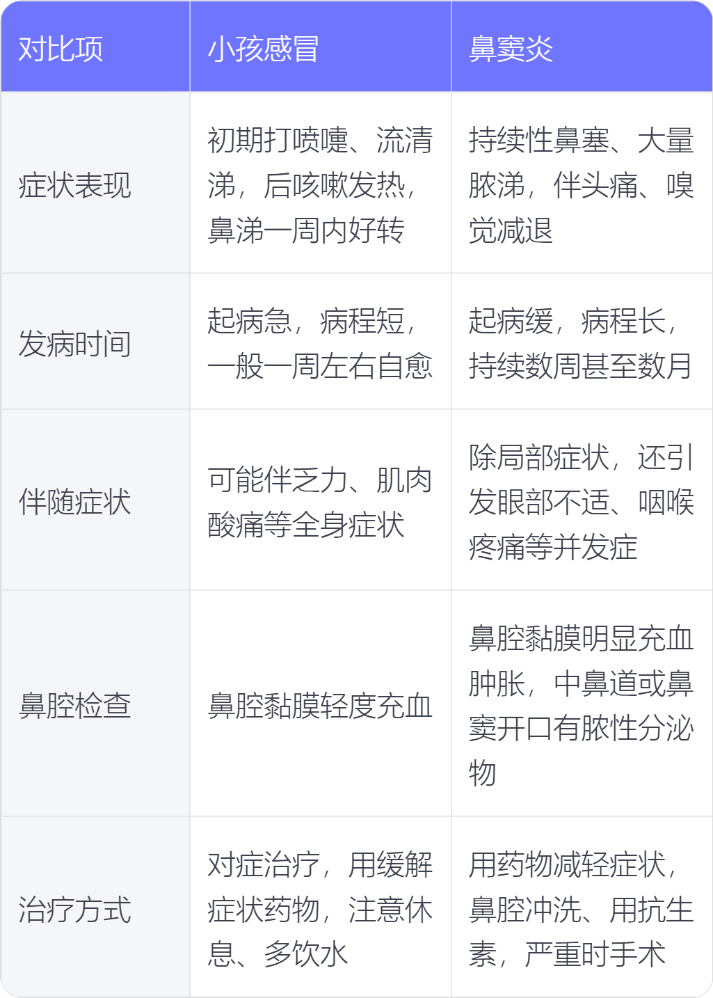小孩感冒与鼻窦炎可从症状表现、发病时间、伴随症状、鼻腔检查、治疗方式来区分。
