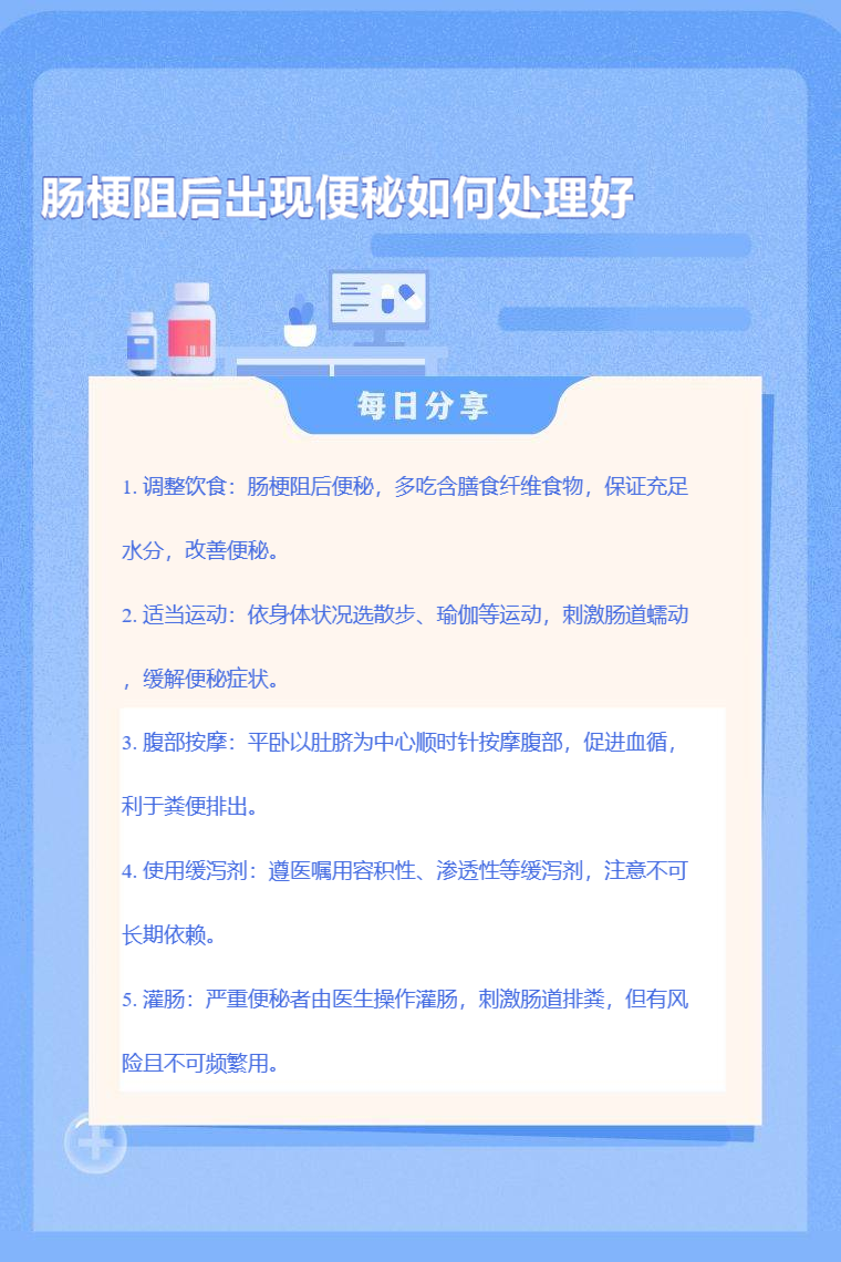 肠梗阻后出现便秘可通过调整饮食、适当运动、腹部按摩、使用缓泻剂、灌肠等方法处理好。