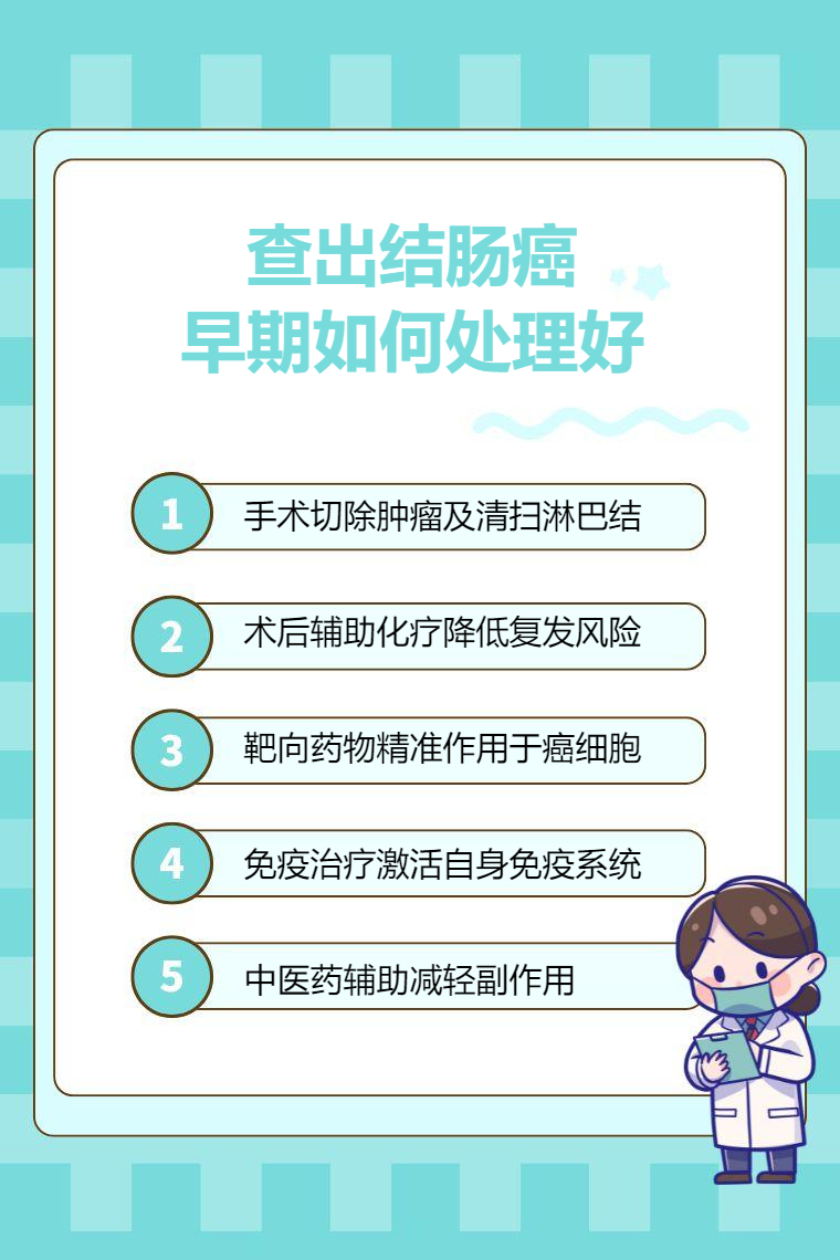 结肠癌早期处理好的方式有手术治疗、化疗、靶向治疗、免疫治疗、中医药辅助治疗好。