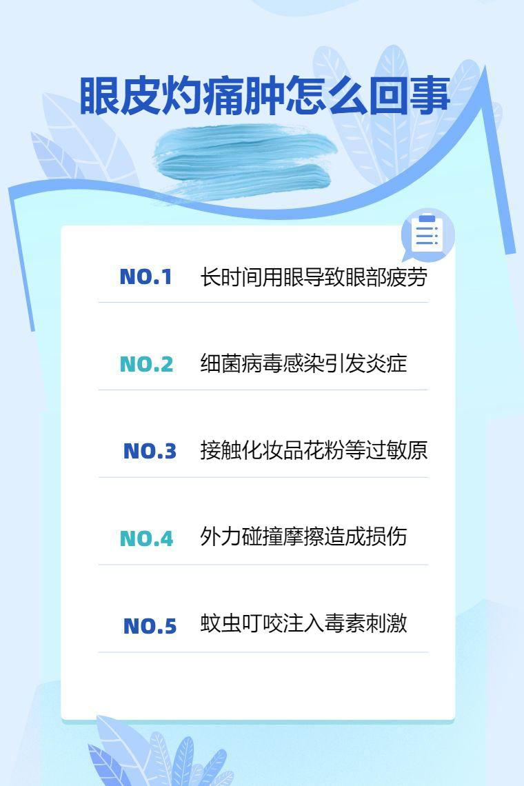 1. 用眼过度:长时间使用电子设备、熬夜等导致用眼疲劳,眼部肌肉紧张,局部血液循环不畅,引发眼皮灼痛肿。减少用眼时间,定时休息,适当做眼保健操,眺望远处,还可热敷眼部促进血液循环缓解症状。