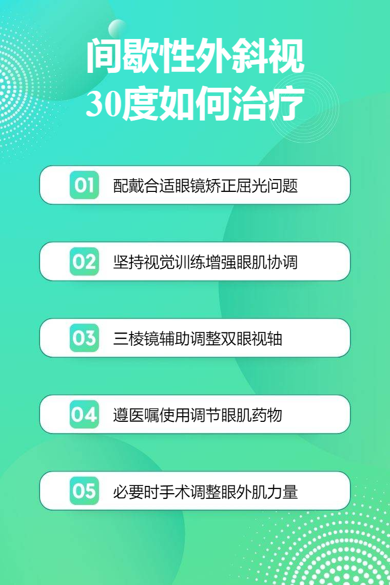 间歇性外斜视30度的治疗方法有配镜矫正、视觉训练、三棱镜治疗、药物治疗、手术治疗等。