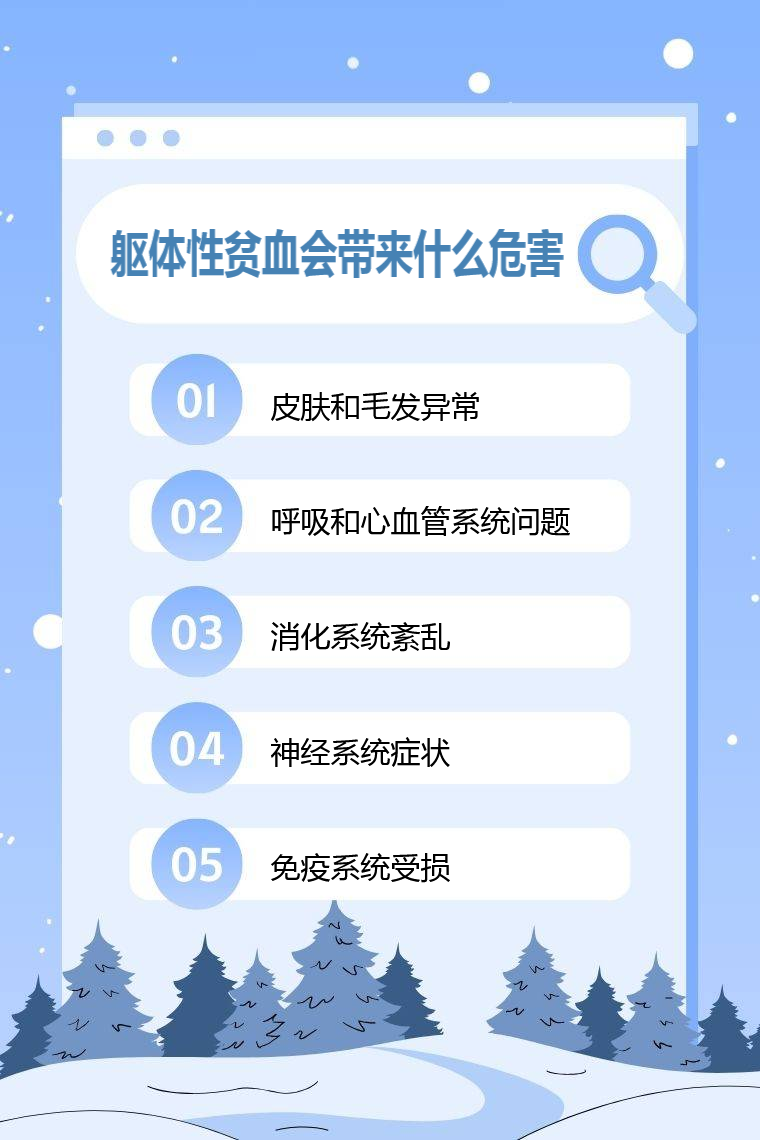 躯体性贫血会带来皮肤和毛发异常、呼吸和心血管系统问题、消化系统紊乱、神经系统症状、免疫系统受损等危害。