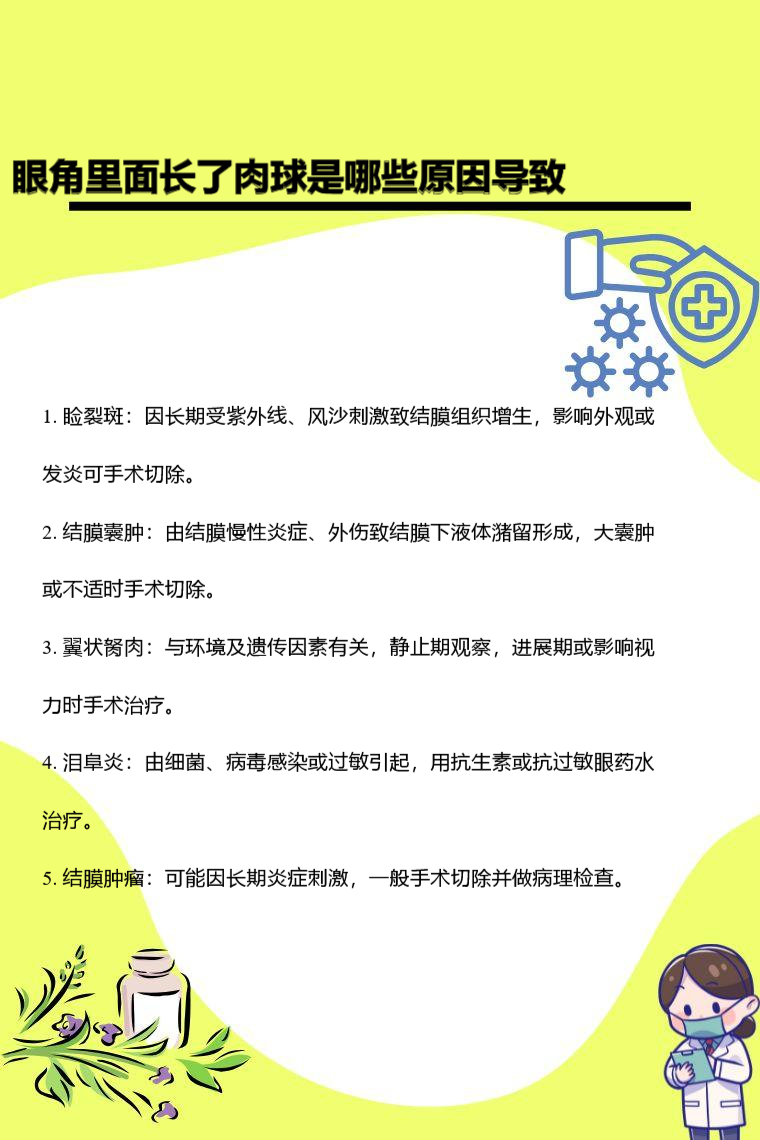 眼角里面长肉球可能由睑裂斑、结膜囊肿、翼状胬肉、泪阜炎、结膜肿瘤等情况导致。