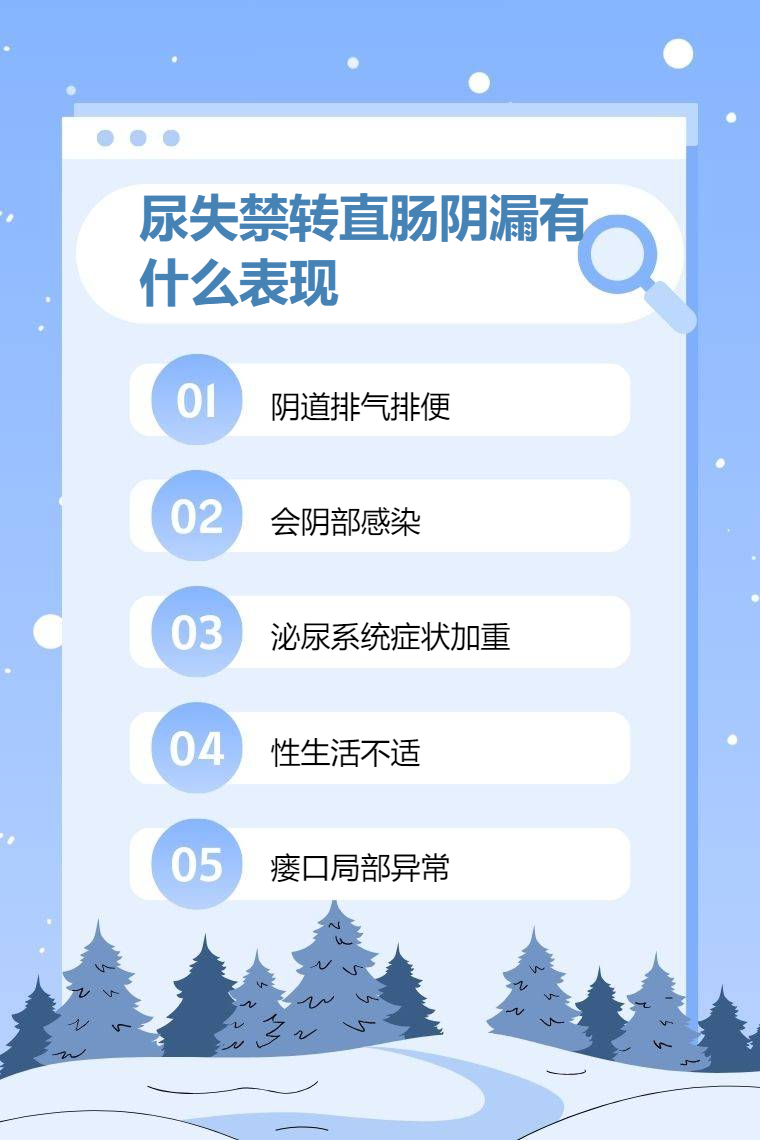 尿失禁患者出现直肠阴道瘘时,常见表现包括阴道排气排便、会阴部感染、泌尿系统症状加重、性生活不适、瘘口局部异常等。
