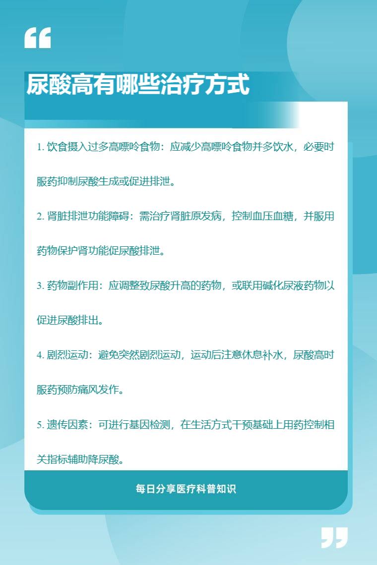 尿酸高可能是饮食摄入过多高嘌呤食物、肾脏排泄功能障碍、药物副作用、剧烈运动、遗传因素等因素,需要针对病因治疗,可采取的方法有调整饮食、改善肾脏功能、调整用药、适当休息、基因检测与管理等。