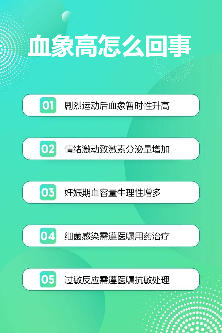 1. 剧烈运动:剧烈运动后身体血液循环加快,代谢增强,可导致血象暂时升高。一般无需特殊治疗。