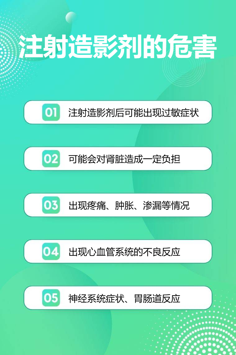 注射造影剂的危害包括过敏反应、肾脏损害、局部不良反应、心血管系统影响、其他罕见危害等。