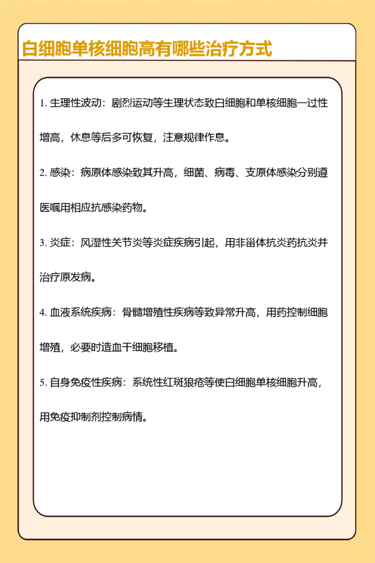 白细胞单核细胞高可能是生理性波动、感染、炎症、血液系统疾病、自身免疫性疾病等因素,需要针对病因治疗,可采取的方法有调整生活方式、抗感染、抗炎、调节免疫等。