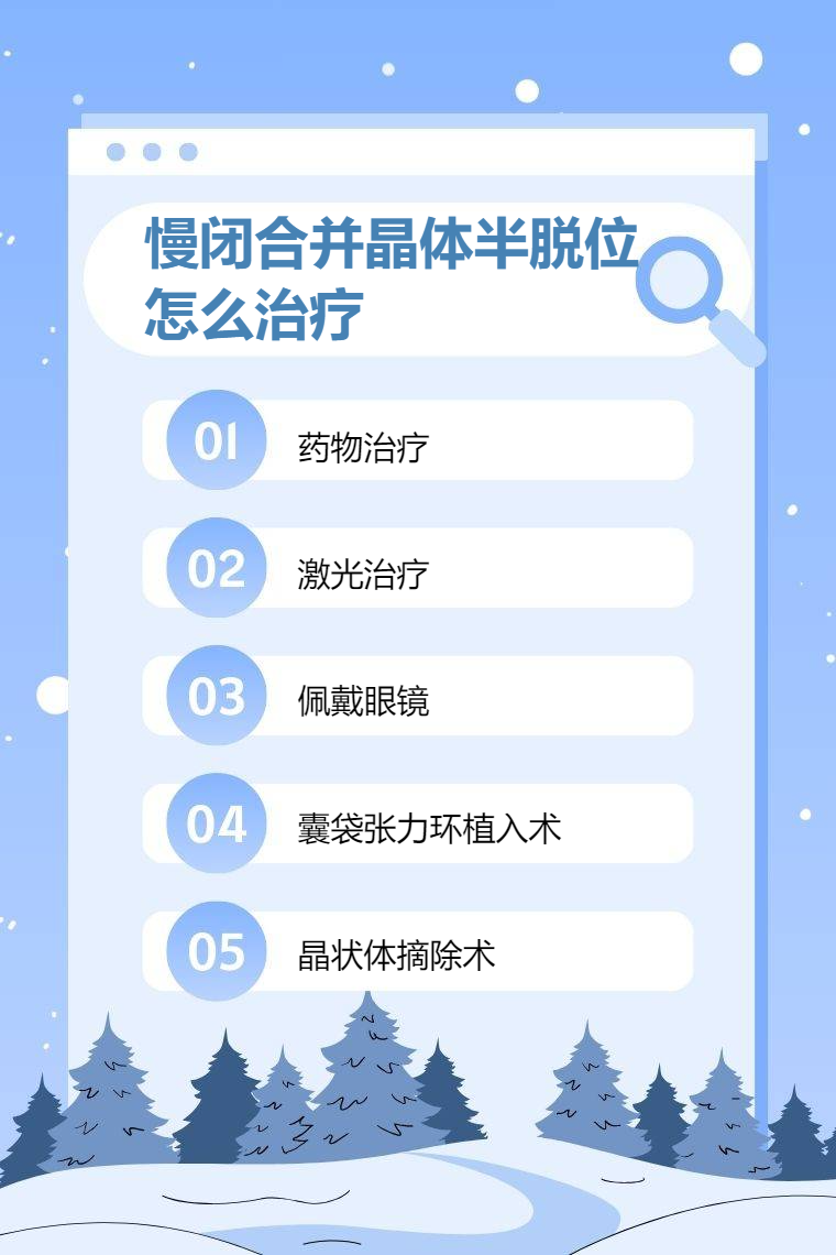 慢闭合并晶体半脱位的治疗方法有药物治疗、激光治疗、佩戴眼镜、囊袋张力环植入术、晶状体摘除术等。