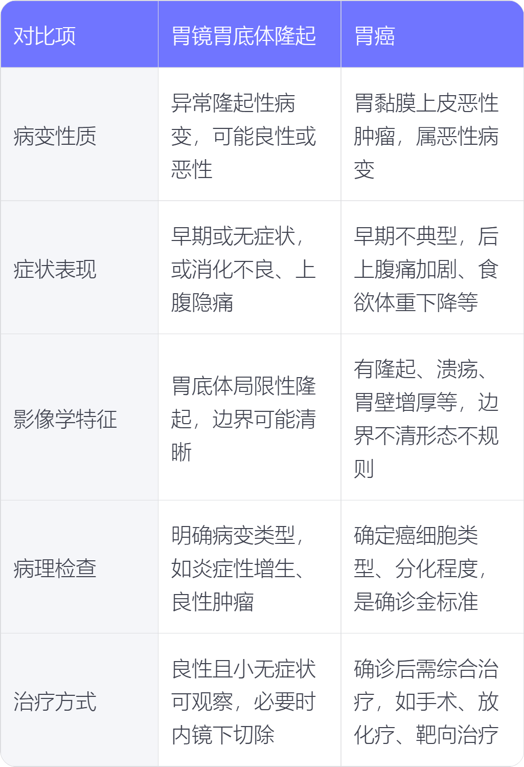 5. 治疗方式:对于良性的胃底体隆起,若较小且无症状,可定期观察,必要时通过内镜下切除;胃癌一旦确诊,通常需要综合治疗,包括手术切除、化疗、放疗、靶向治疗等。
