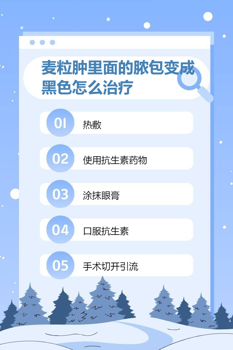 麦粒肿里面的脓包变成黑色可通过热敷、使用抗生素药物、涂抹眼膏、口服抗生素、手术切开引流等方法治疗。