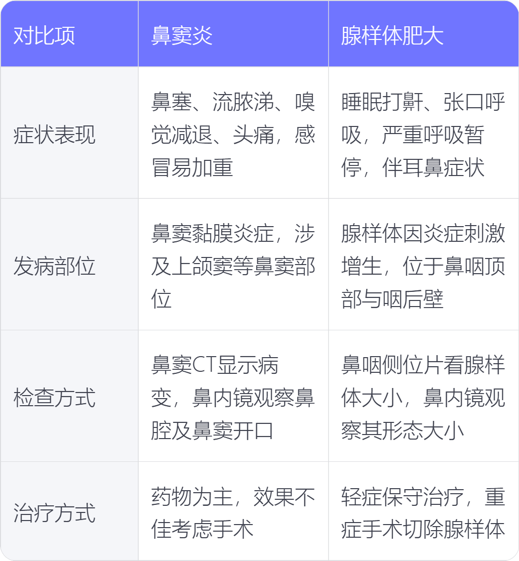 4. 治疗方式:鼻窦炎治疗以药物为主,如使用鼻用糖皮质激素、抗生素、黏液促排剂等,药物治疗效果不佳时可考虑手术。腺样体肥大若症状较轻,可先采取保守治疗,如使用鼻喷药物、孟鲁司特等;若症状严重,出现睡眠呼吸暂停等情况,通常需手术切除腺样体 。