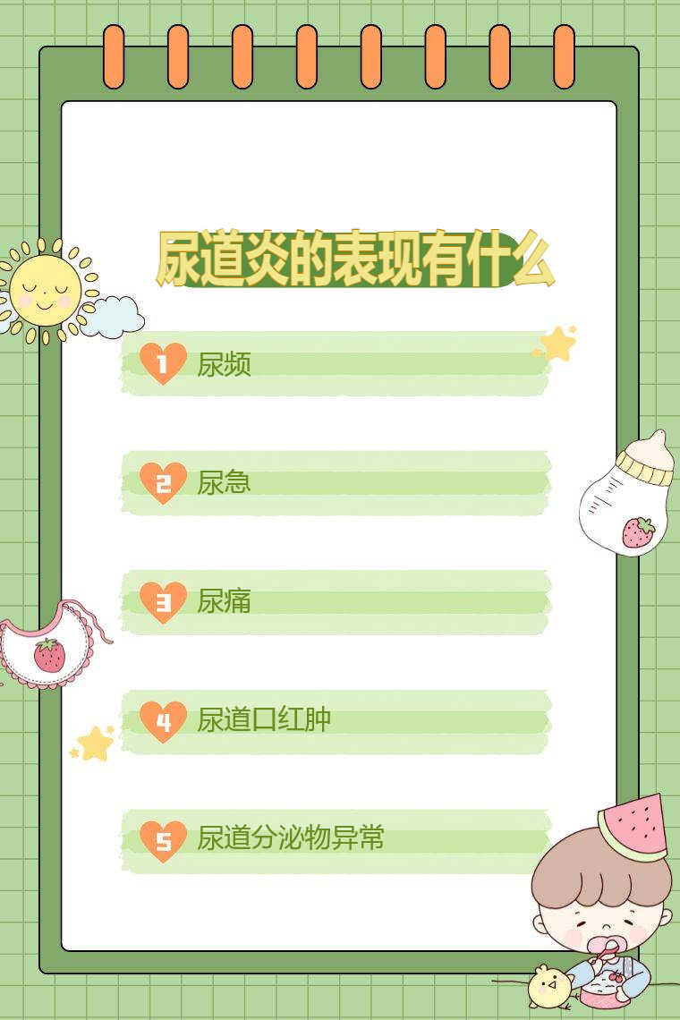 尿道炎的表现有尿频、尿急、尿痛、尿道口红肿、尿道分泌物异常等。