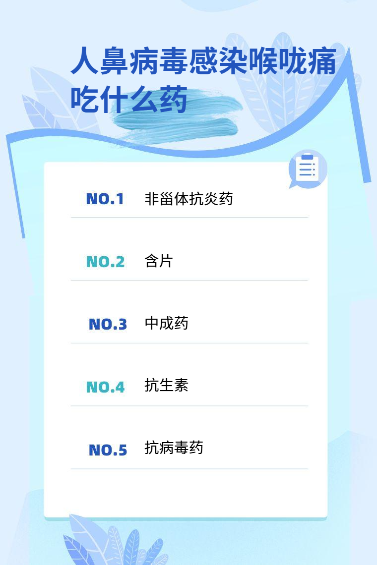 人鼻病毒感染喉咙痛可服用的药物有非甾体抗炎药、含片、中成药、抗生素、抗病毒药等。
