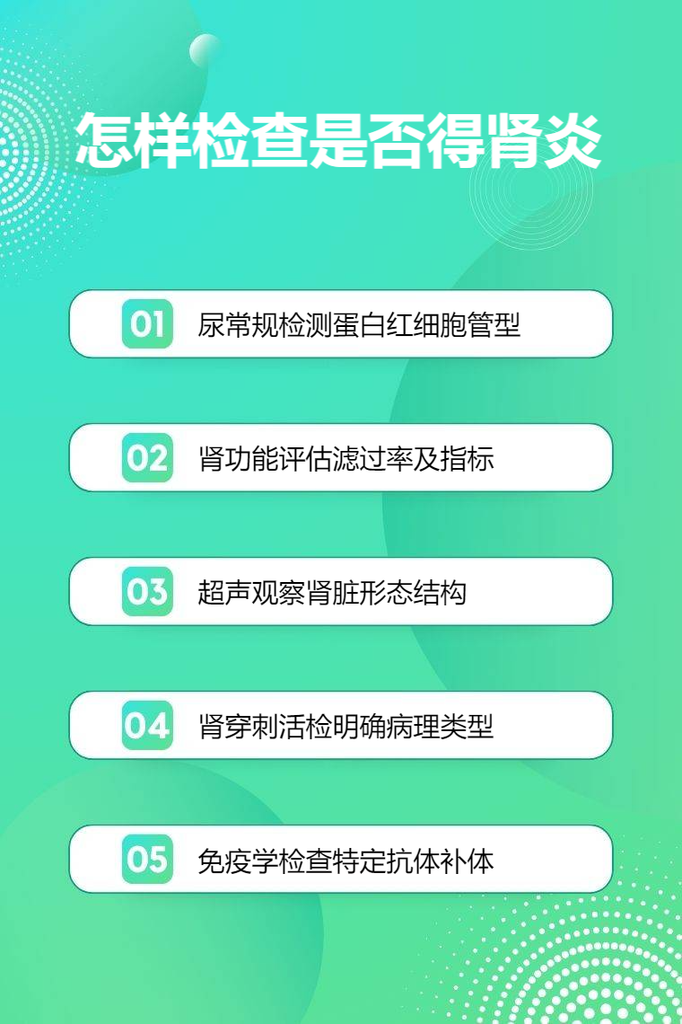 检查是否得肾炎可通过尿常规、肾功能检查、肾脏超声、肾穿刺活检、免疫学检查等。