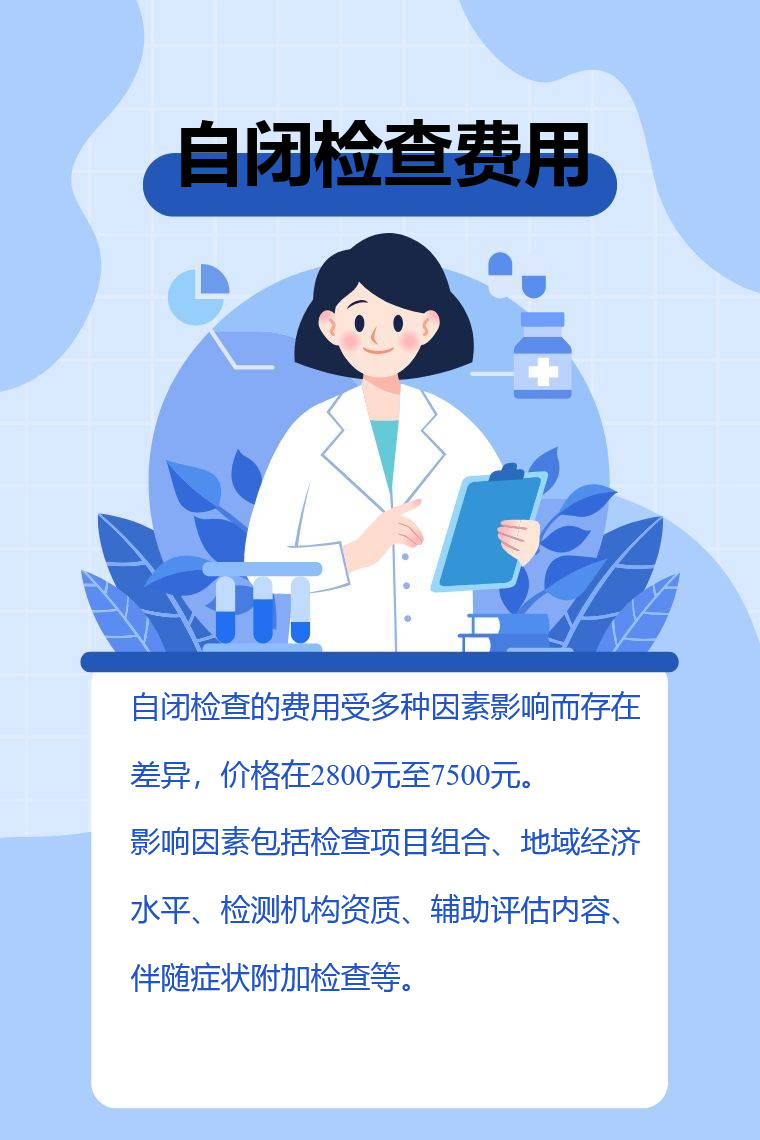 自闭检查的费用受多种因素影响而存在差异,价格在2800元至7500元。影响因素包括检查项目组合、地域经济水平、检测机构资质、辅助评估内容、伴随症状附加检查等。