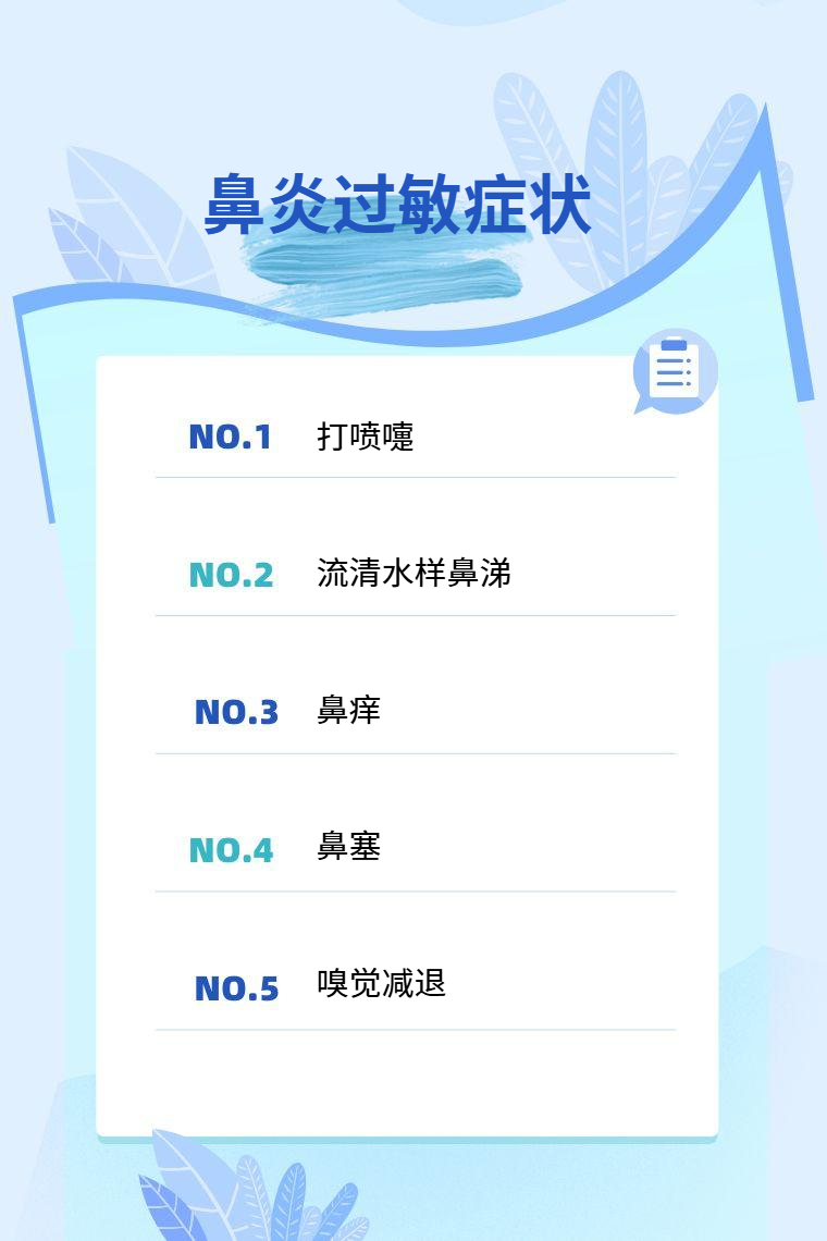 鼻炎过敏症状主要包括打喷嚏、流清水样鼻涕、鼻痒、鼻塞、嗅觉减退、眼部瘙痒及流泪等。