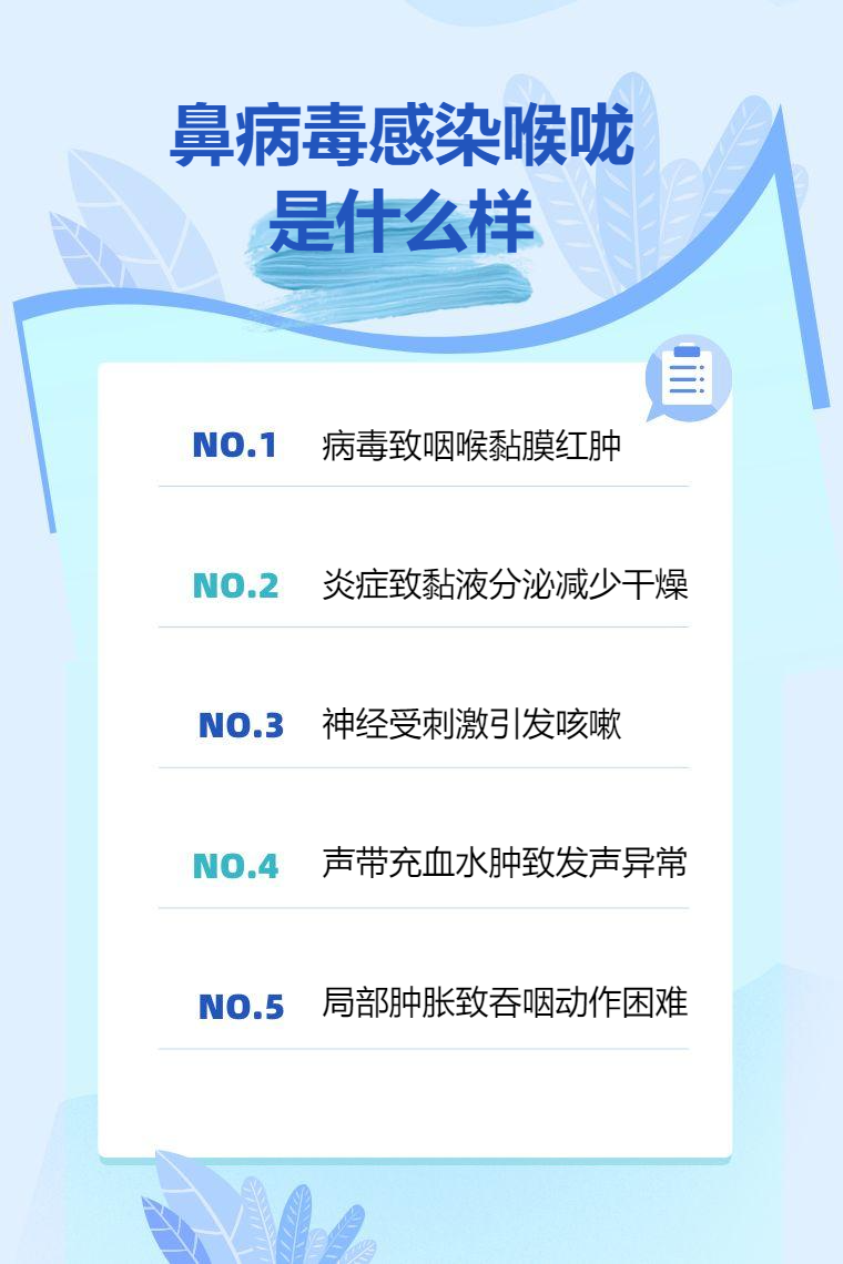 鼻病毒感染喉咙可出现咽痛、咽干、咳嗽、声音嘶哑、吞咽困难等。