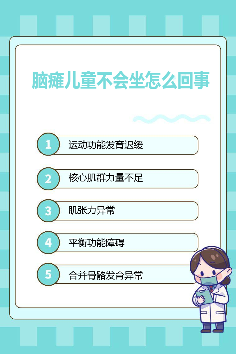脑瘫儿童不会坐的常见原因包括运动功能发育迟缓、核心肌群力量不足、肌张力异常、平衡功能障碍、合并骨骼发育异常等。