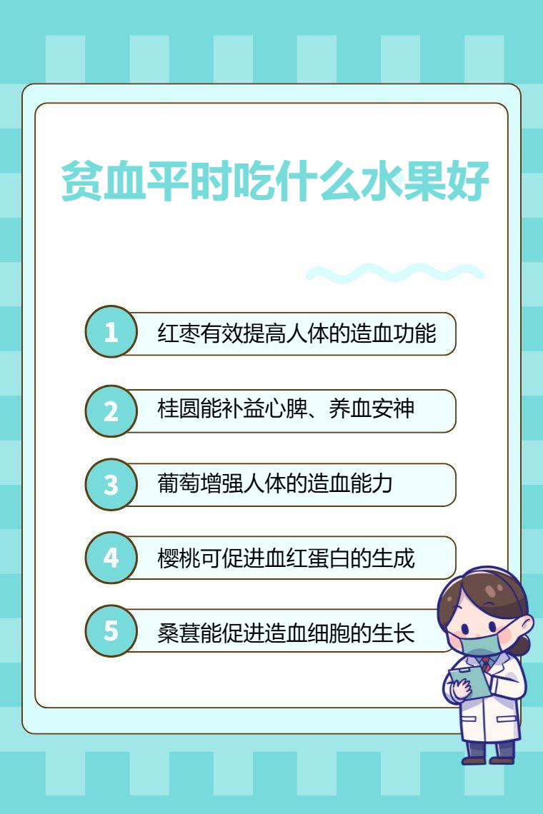 贫血时可选择红枣、桂圆、葡萄、樱桃、桑葚等水果。
