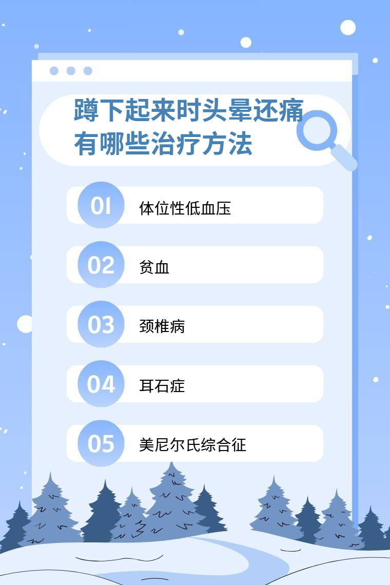 蹲下起来时头晕还痛可能是体位性低血压、贫血、颈椎病、耳石症、美尼尔氏综合征等因素,需要针对病因治疗,可采取的方法有改善生活方式、药物治疗、复位治疗等。
