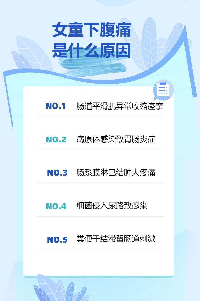 女童下腹痛常见于饮食不当或剧烈运动引发的肠道痉挛、急性胃肠炎、肠系膜淋巴结炎、尿路感染、功能性便秘等情况。