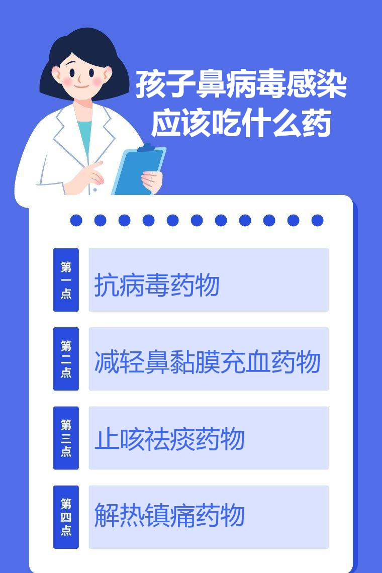 孩子鼻病毒感染可使用的药物有抗病毒药物、减轻鼻黏膜充血药物、止咳祛痰药物、解热镇痛药物等。