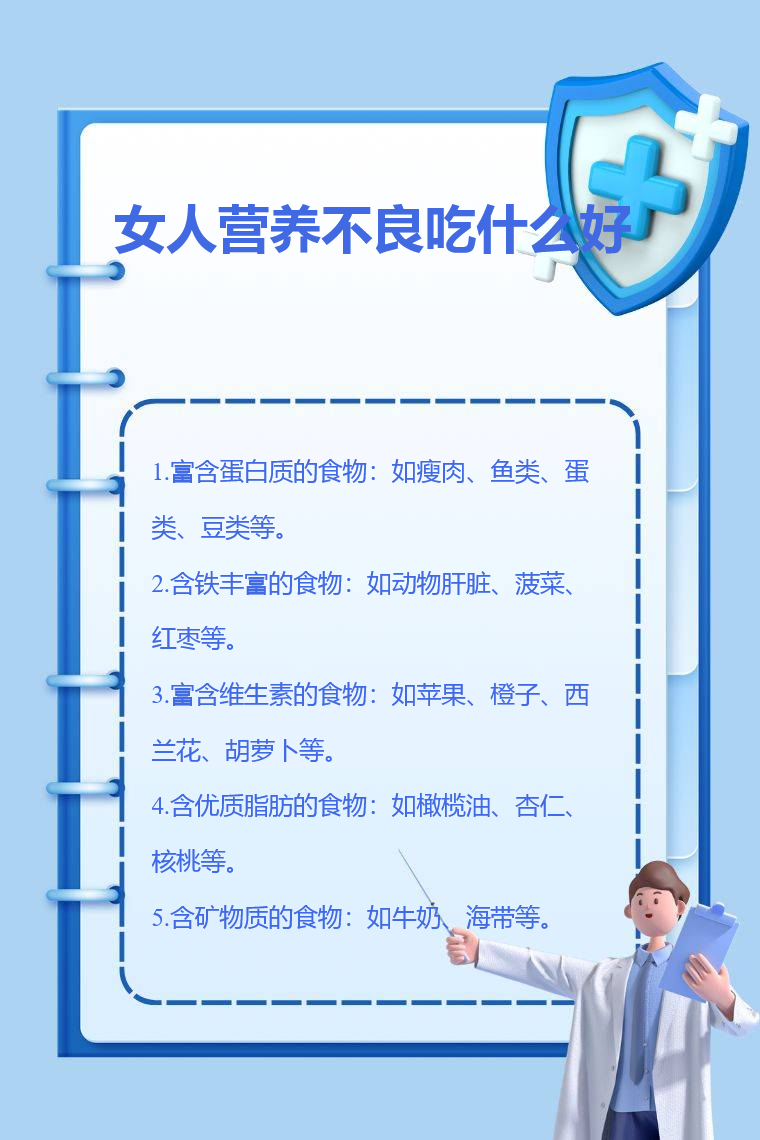 女人营养不良一般吃富含蛋白质的食物、含铁丰富的食物、富含维生素的食物、含优质脂肪的食物、含矿物质的食物等比较好。
