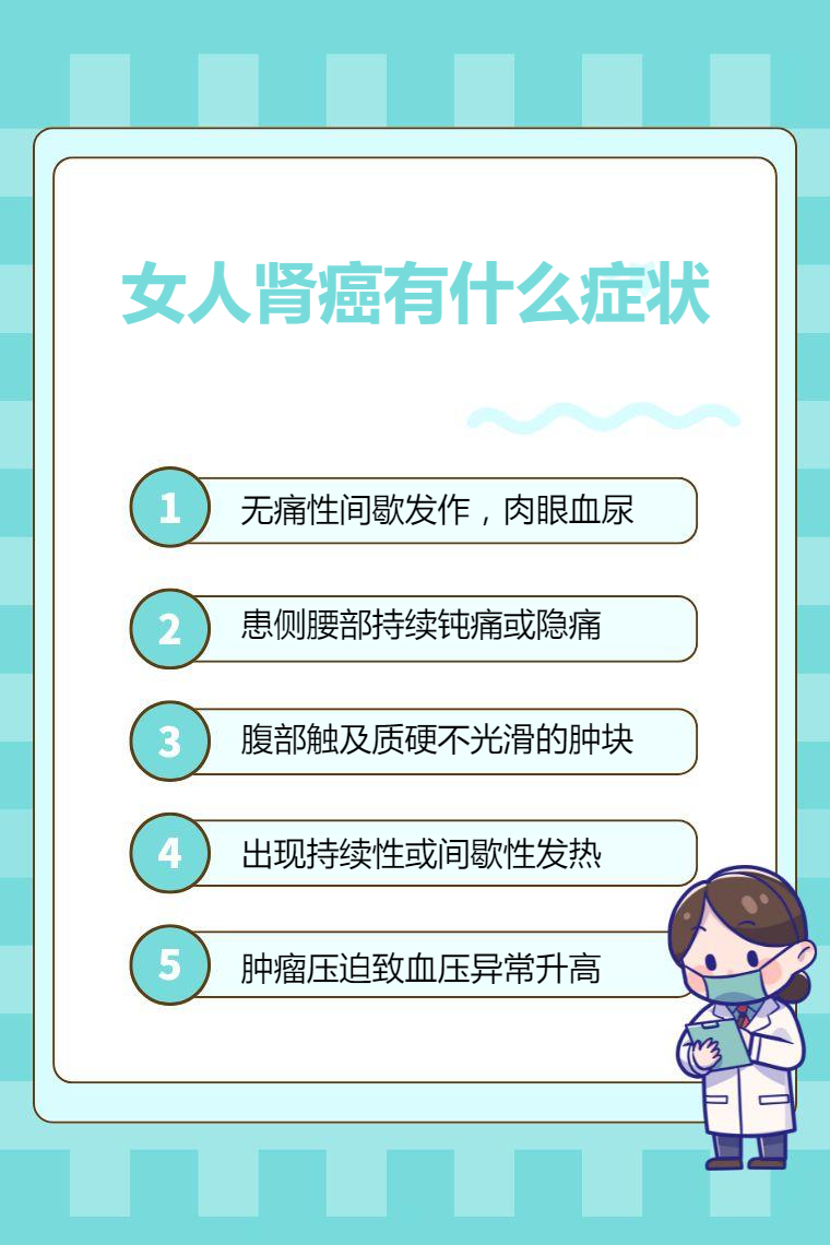 女人肾癌的症状有血尿、腰痛、腹部肿块、发热、高血压等。