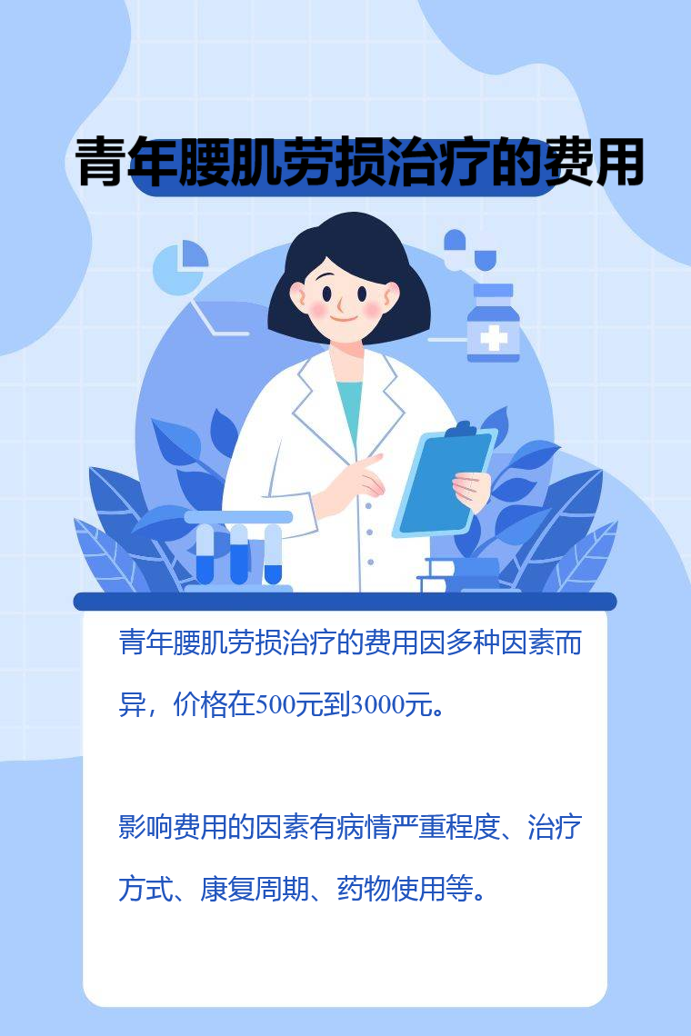 青年腰肌劳损治疗的费用因多种因素而异,价格在500元到3000元。影响费用的因素有病情严重程度、治疗方式、康复周期、药物使用等。