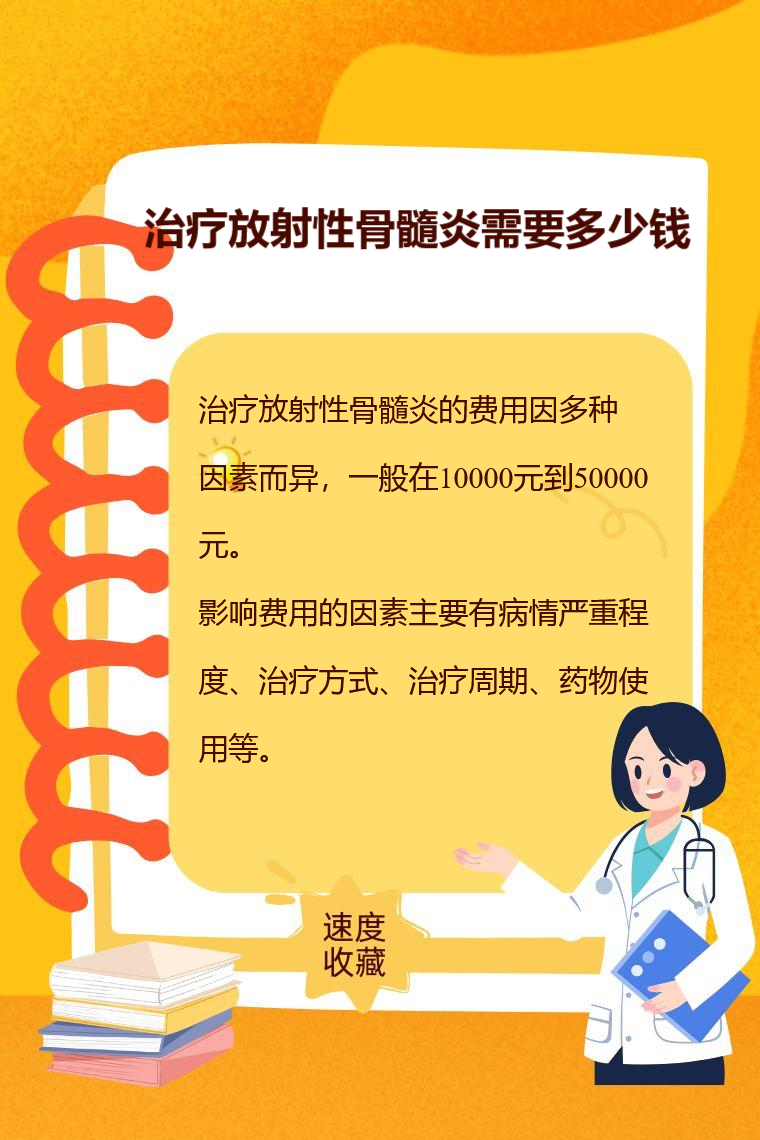 治疗放射性骨髓炎的费用因多种因素而异,一般在10000元到50000元。影响费用的因素主要有病情严重程度、治疗方式、治疗周期、药物使用等。