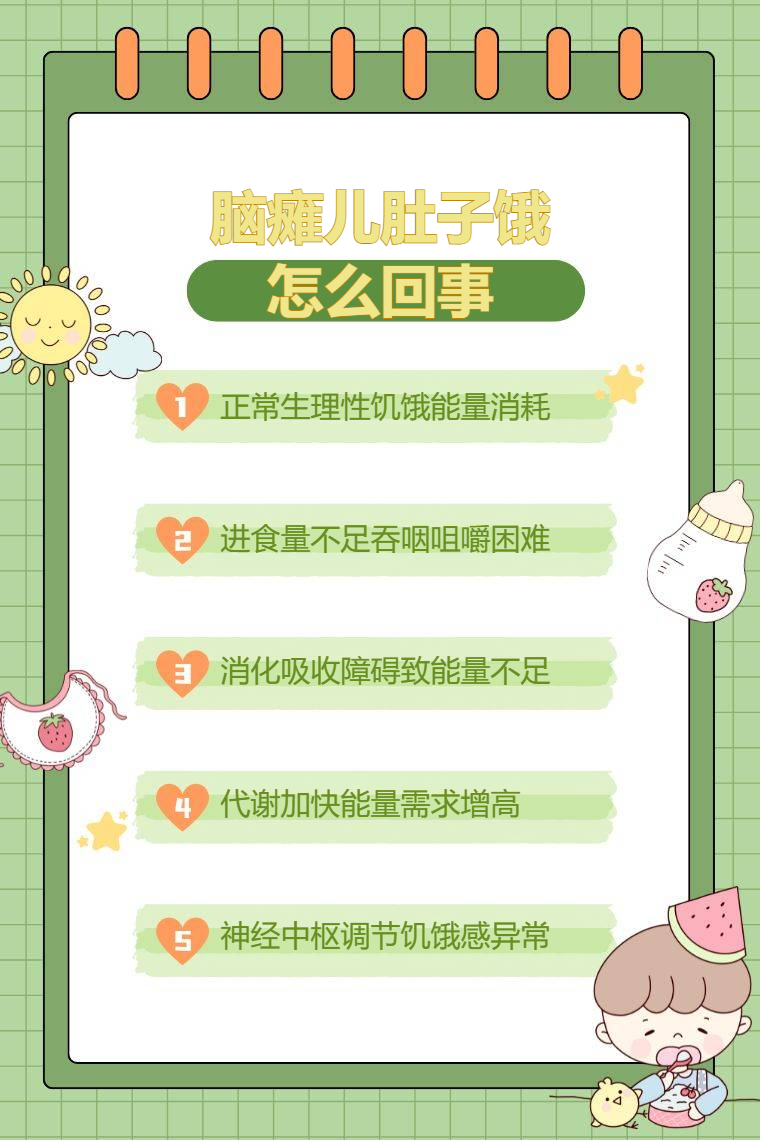 5.神经调节异常:脑瘫患儿脑部损伤可能影响下丘脑等调控饥饿与饱腹感的神经中枢功能,导致饥饿信号传递紊乱,出现异常频繁的饥饿感或饥饿感知迟钝等情况,需通过专业评估后进行针对性神经康复干预。
