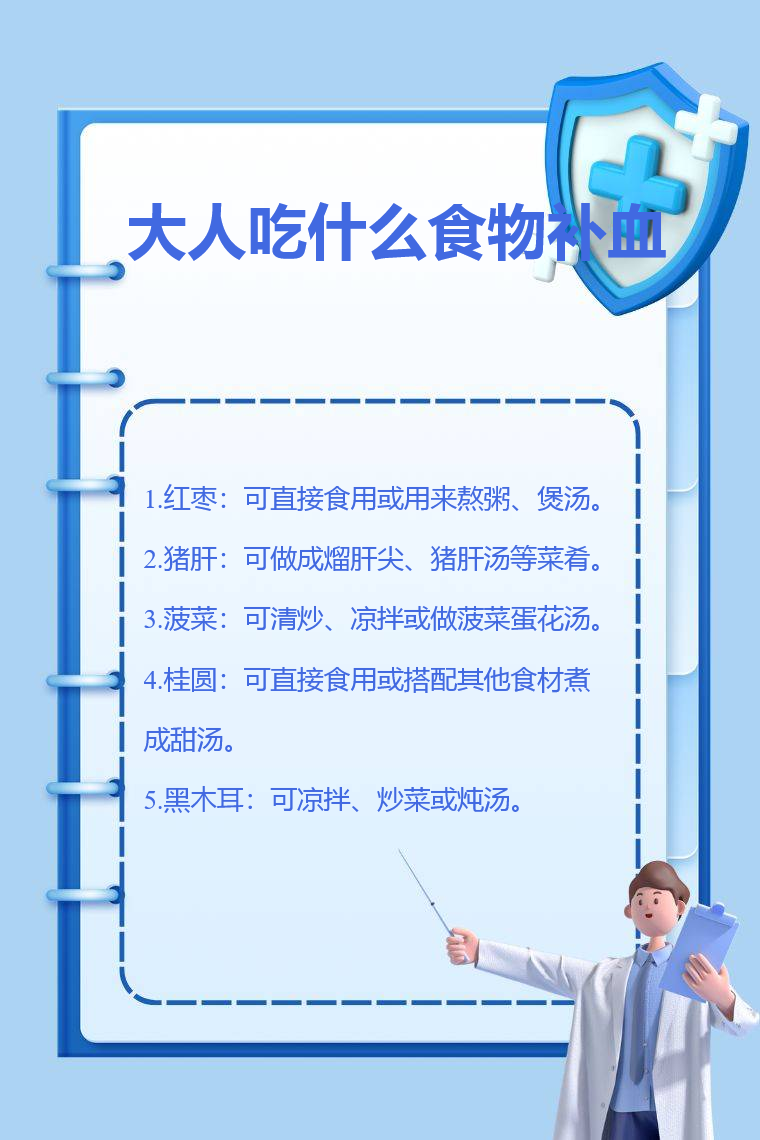 红枣、猪肝、菠菜、桂圆、黑木耳等都是适合大人补血的食物。