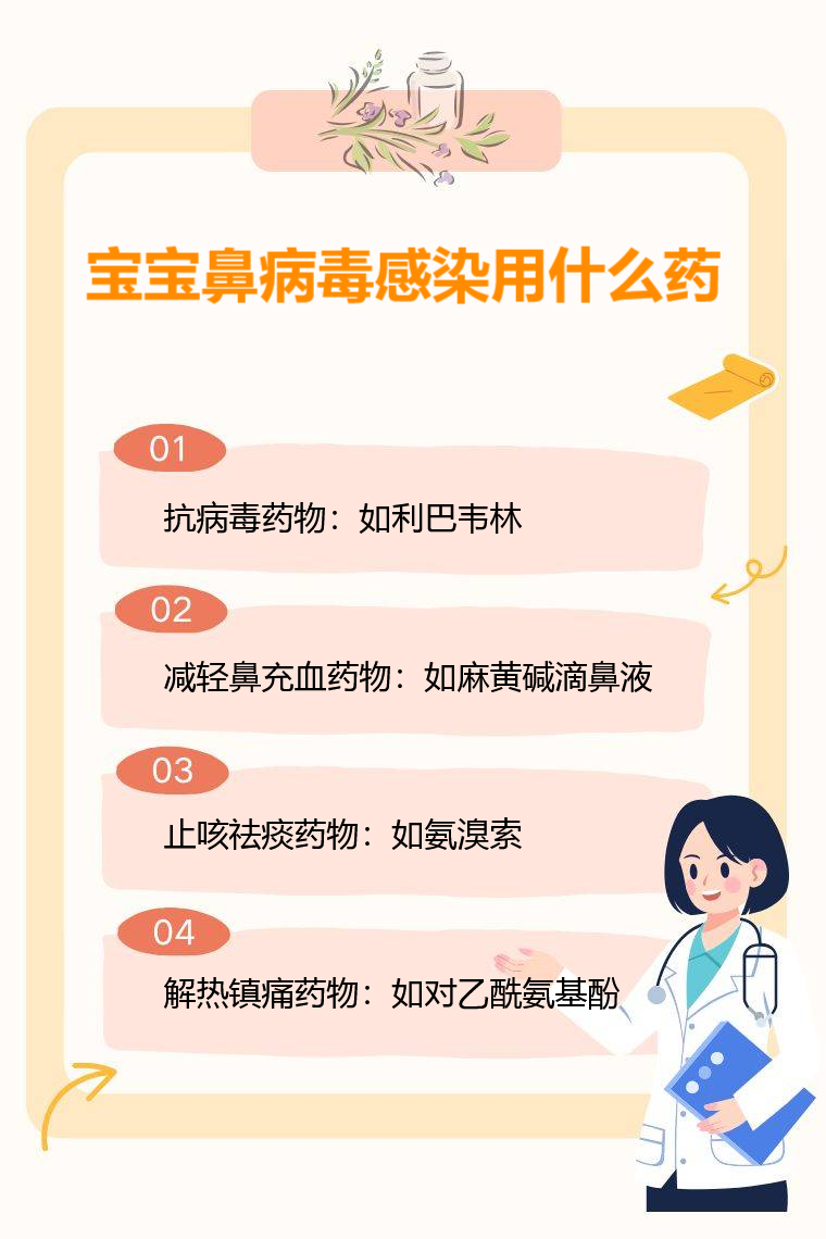 宝宝鼻病毒感染常用药物有抗病毒药物、减轻鼻充血药物、止咳祛痰药物、解热镇痛药物等。