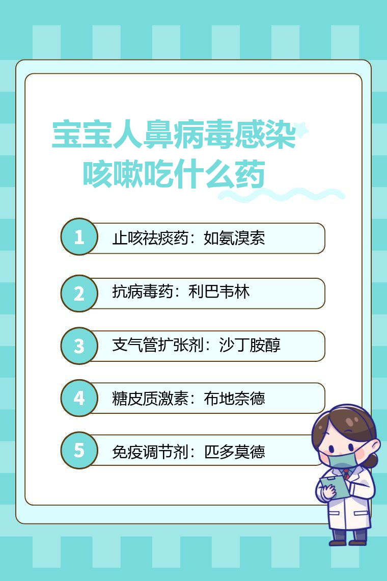 宝宝人鼻病毒感染咳嗽可使用的药物有止咳祛痰药、抗病毒药、支气管扩张剂、糖皮质激素、免疫调节剂等。