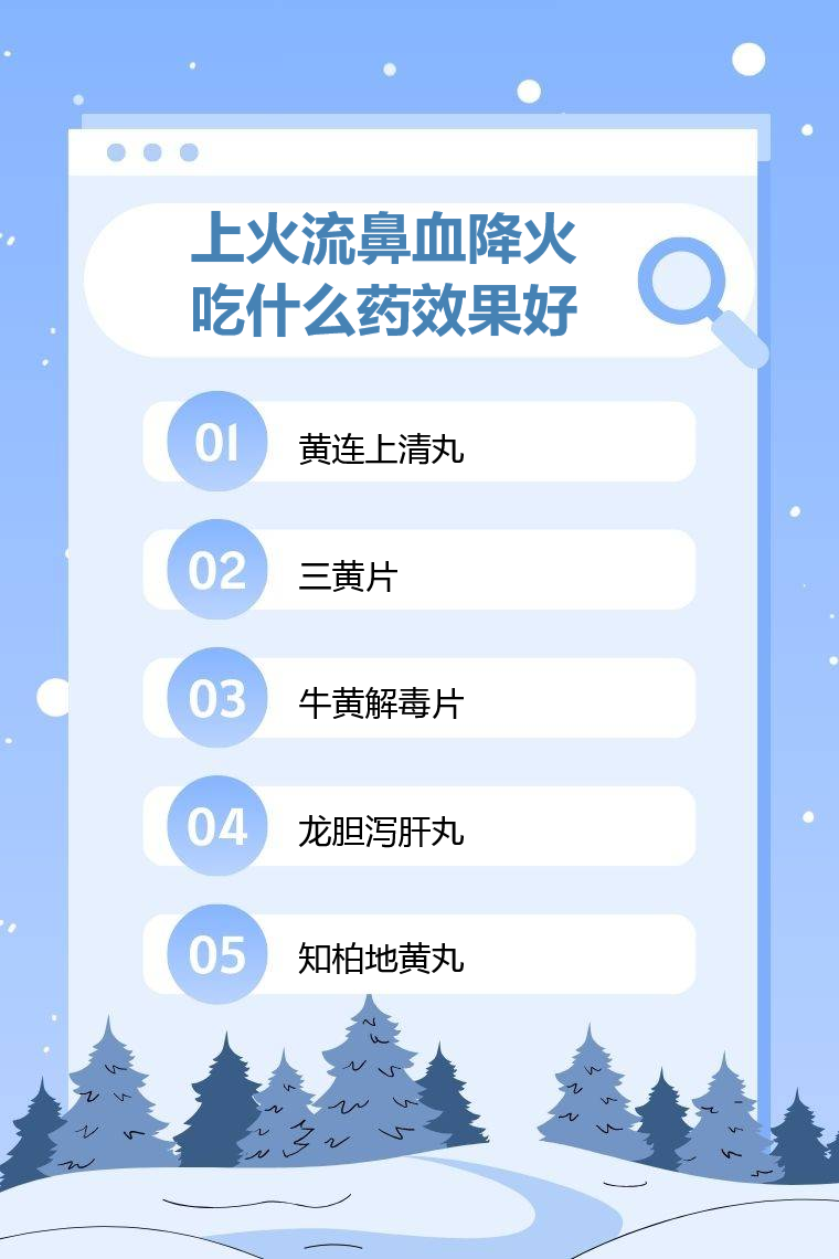 上火流鼻血的人降火吃黄连上清丸、三黄片、牛黄解毒片、龙胆泻肝丸、知柏地黄丸效果好,但需遵医嘱用药。
