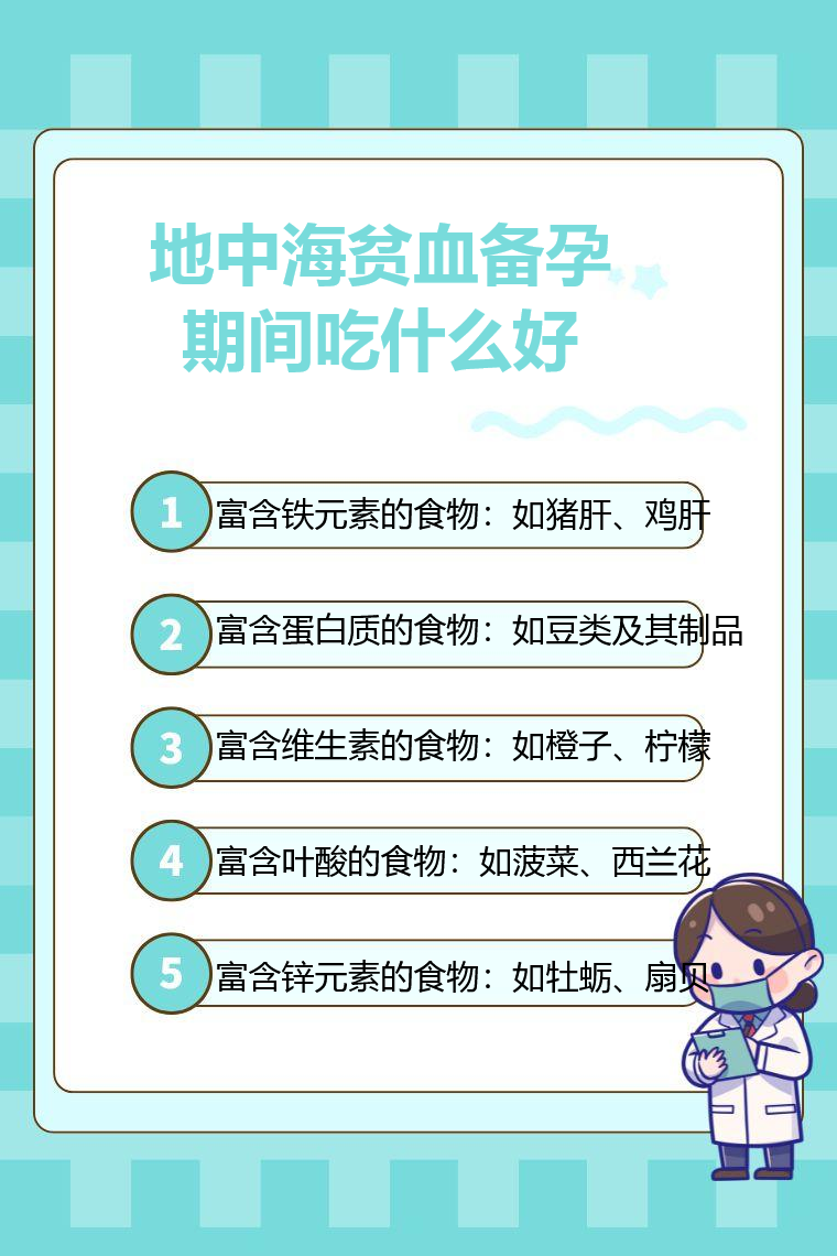 地中海贫血备孕期间可多吃富含铁元素、蛋白质、维生素、叶酸、锌元素的食物等。