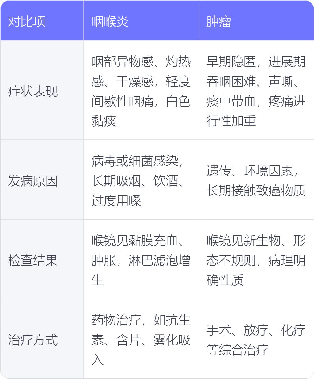 症状表现、发病原因、检查结果、治疗方式可帮助判断是咽喉炎还是肿瘤。