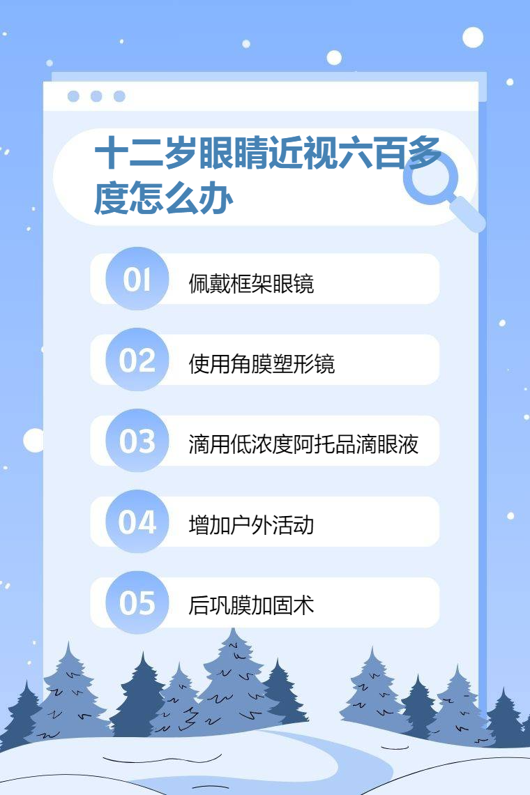 12 岁眼睛近视六百多度可通过佩戴框架眼镜、使用角膜塑形镜、滴用低浓度阿托品滴眼液、增加户外活动、后巩膜加固术等方法改善。