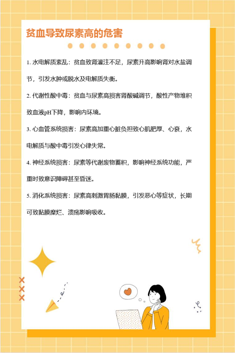 贫血导致尿素高可能引发水电解质紊乱、代谢性酸中毒、心血管系统损害、神经系统损害、消化系统损害等。