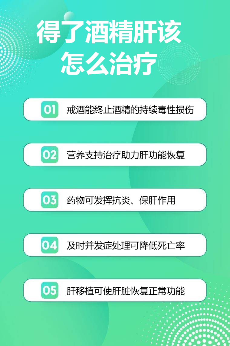 得了酒精肝可通过戒酒、营养支持治疗、药物治疗、并发症处理、肝移植手术等方法进行治疗。