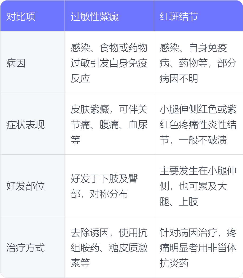 过敏性紫癜与红斑结节在病因、症状表现、好发部位、治疗方式上存在不同。